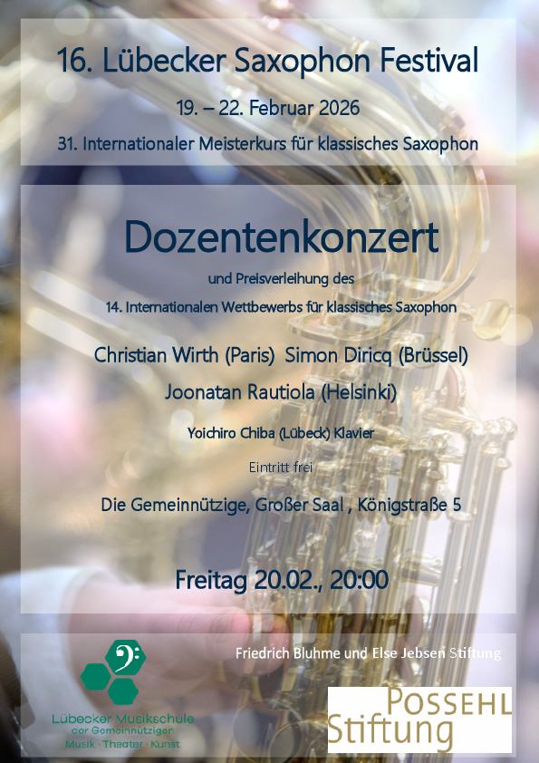Vom 19.-22.02.2026. veranstaltet die Lübecker Musikschule der Gemeinnützigen über die Saxophonklasse von Lilija Russanowa den 31. Internationalen Meisterkurs für klassisches Saxophon. Als Dozenten reisen Christian Wirth aus Basel, Simon Diricq aus Brüssel und Joonatan Rautiola aus Helsinki an. Alle drei sind es als Saxophonisten von Weltrang eigentlich gewohnt, Meisterkurse und Konzerte an großen Festivals zu geben. Umso besonderer erscheint es, dass Lilija Russanowa seit etwa zwei Jahrzehnten regelmäßig die Elite der klassischen Saxophonwelt an der Lübecker Musikschule der Gemeinnützigen vereint.